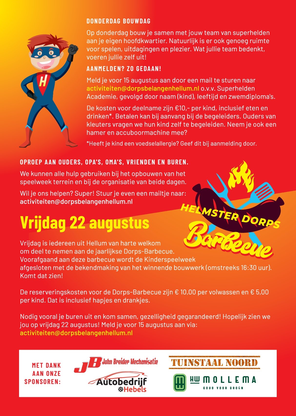 Kinderspeelweek 2025: Hellum Superheldenacademie & dorpsbarbecue – Flyer – achterkant